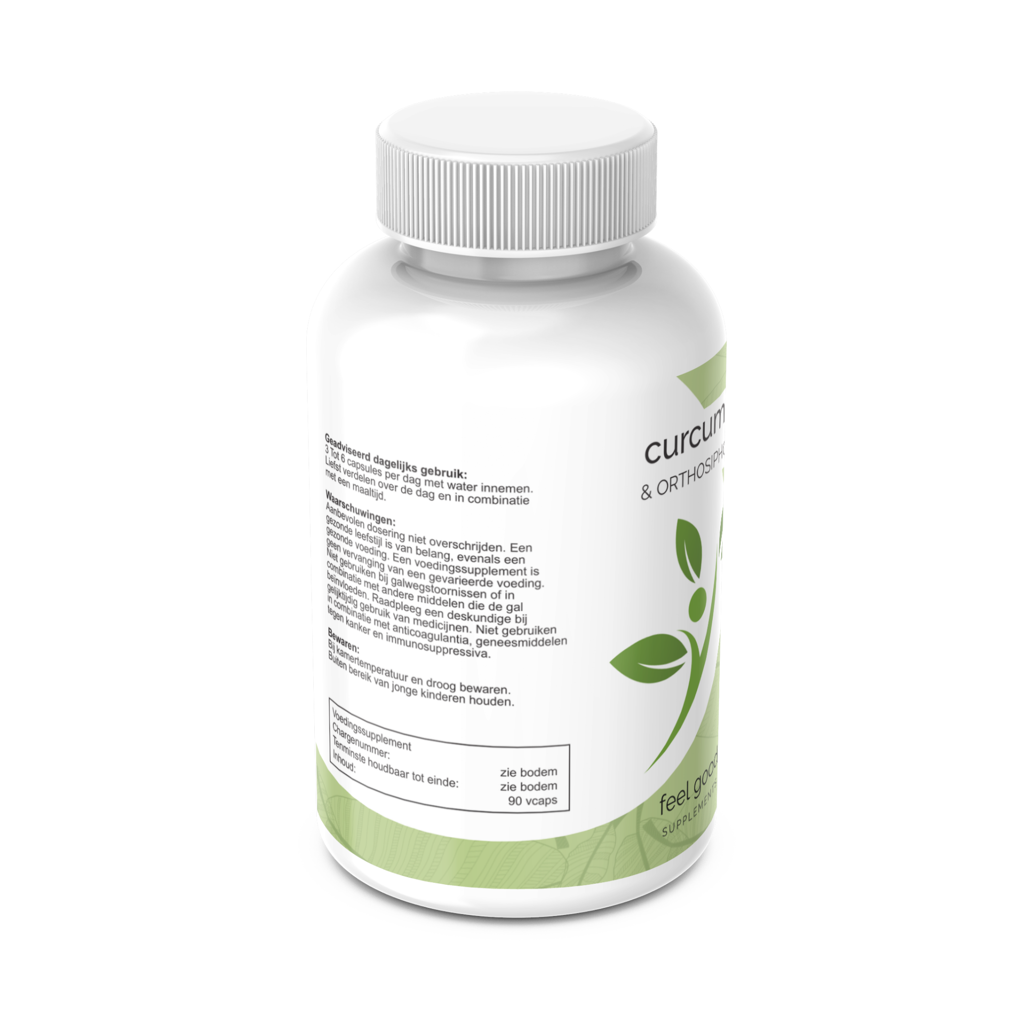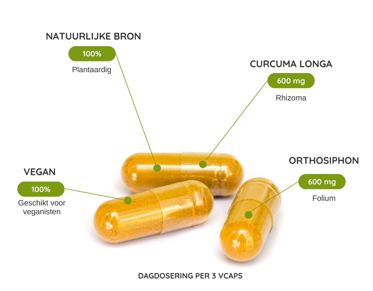 Curcuma longa, Orthosipnonis folium, calcium gebonden vetzuren (antiklontermiddel), HPMC (verdikkingsmiddel/capsulehuls).