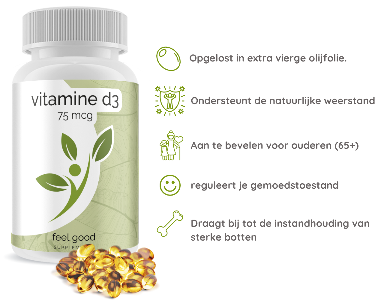 √ Hoge dosering vitamine D (75 mcg 3000 IE per softgel)