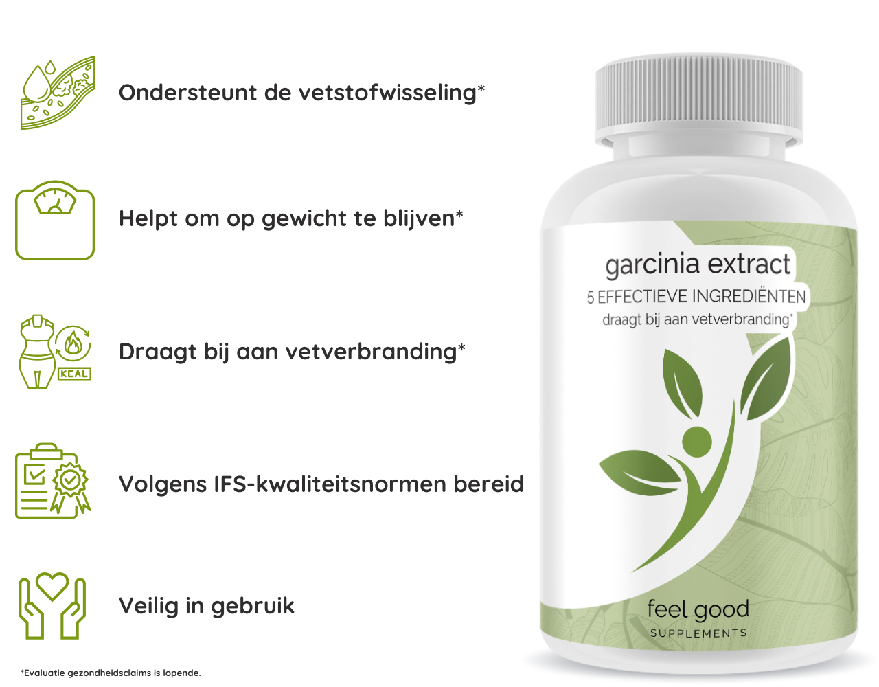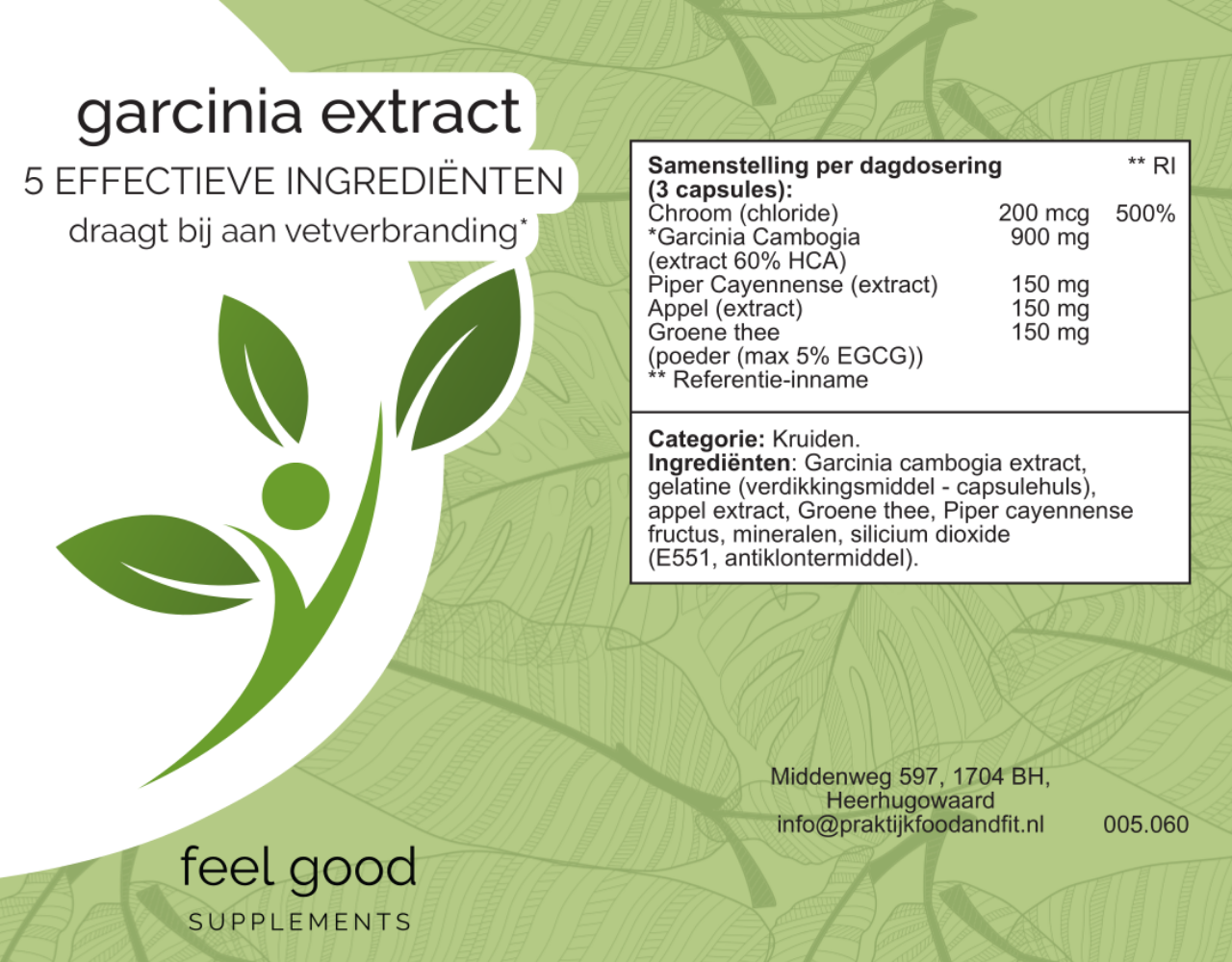 Garcinia cambogia extract, gelatine (verdikkingsmiddel - capsulehuls), appel extract, Groene thee, Piper cayennense fructus, mineralen, silicium dioxide (E551, antiklontermiddel).