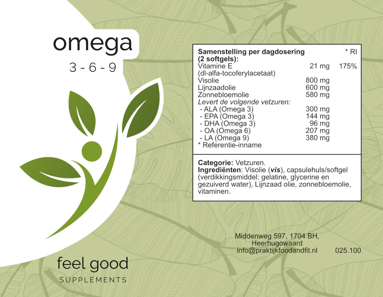Visolie (vis), capsulehuls/softgel (verdikkingsmiddel: gelatine, glycerine en gezuiverd water), Lijnzaad olie, zonnebloemolie, vitaminen.