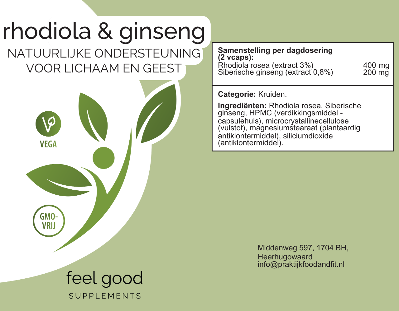 Rhodiola rosea, Siberische ginseng , HPMC (verdikkingsmiddel/capsulehuls), microcrystalline cellulose (vulstof), magnesium stearaat (plantaardig - antiklontermiddel), silicium dioxide (antiklontermiddel).
