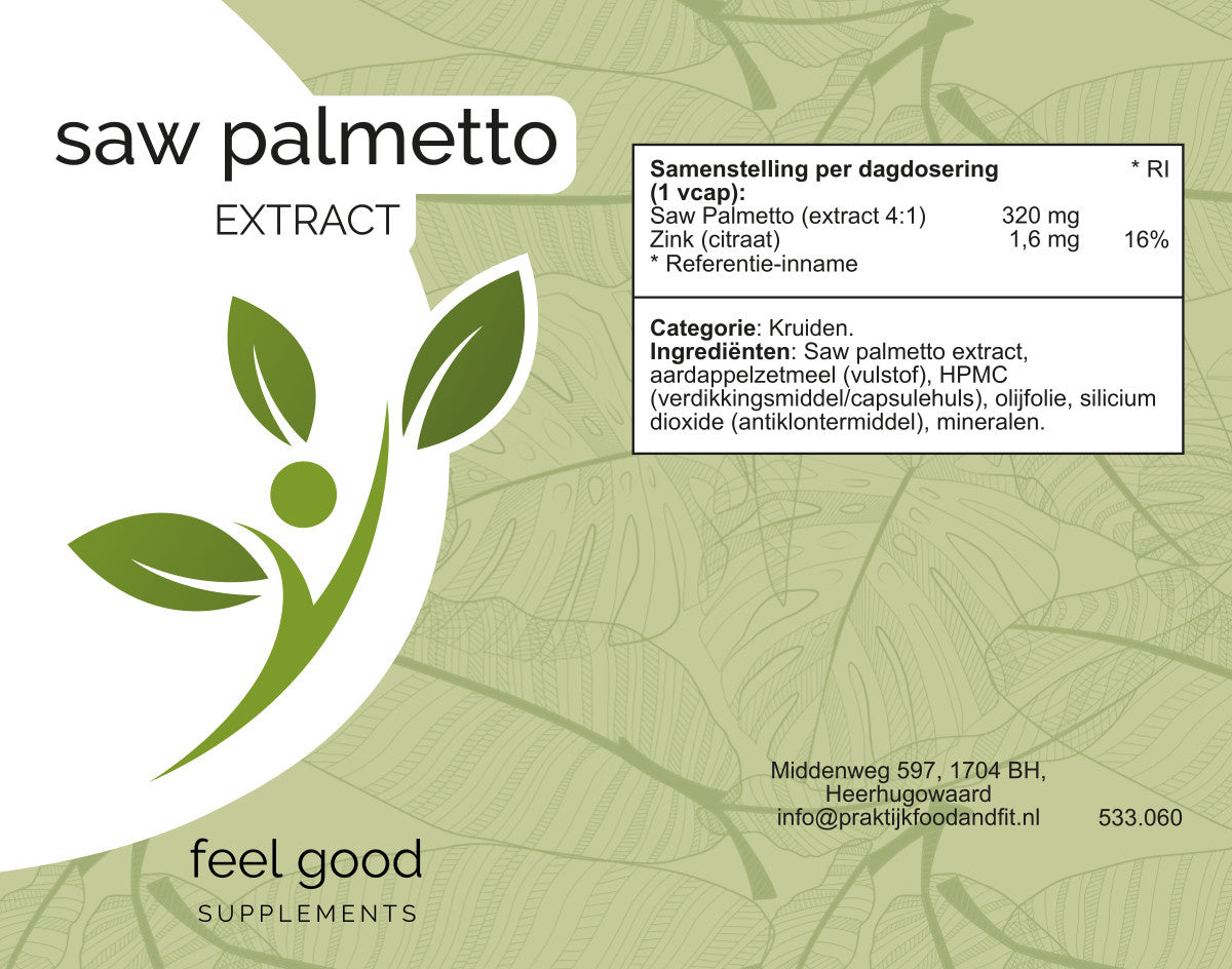 Saw palmetto extract, aardappelzetmeel, HPMC (verdikkingsmiddel/capsulehuls), olijfolie, silicium dioxide (E551, antiklontermiddel), mineralen.