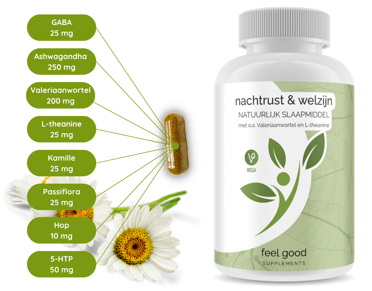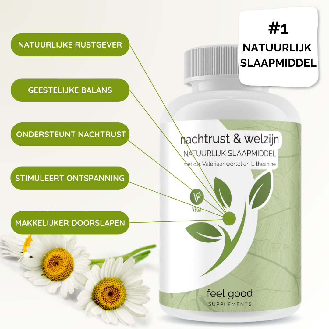 Val jij ’s avonds moeilijk in slaap of word je midden in de nacht wakker? Met Nachtrust en Welzijn geef je je lichaam en geest de rust die het verdient. Deze natuurlijke formule helpt je niet alleen sneller in slaap te vallen, maar zorgt er ook voor dat je langer en dieper blijft slapen. Het resultaat? Je wordt fris en uitgerust wakker, klaar om de dag te beginnen!