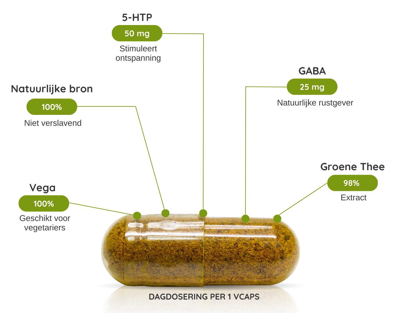 Ashwagandha extract KSM 66 (melk, lactose), Valeriaanwortel extract, HPMC (verdikkingsmiddel/capsulehuls), L-theanine (Groene thee extract 98%), GABA, Kamille extract, Passiflora extract, Hop extract, magnesium stearaat (E572, plantaardig - antiklontermiddel), microcrystalline cellulose (E460i, vulstof), siliciumdioxide (E551, antiklontermiddel).