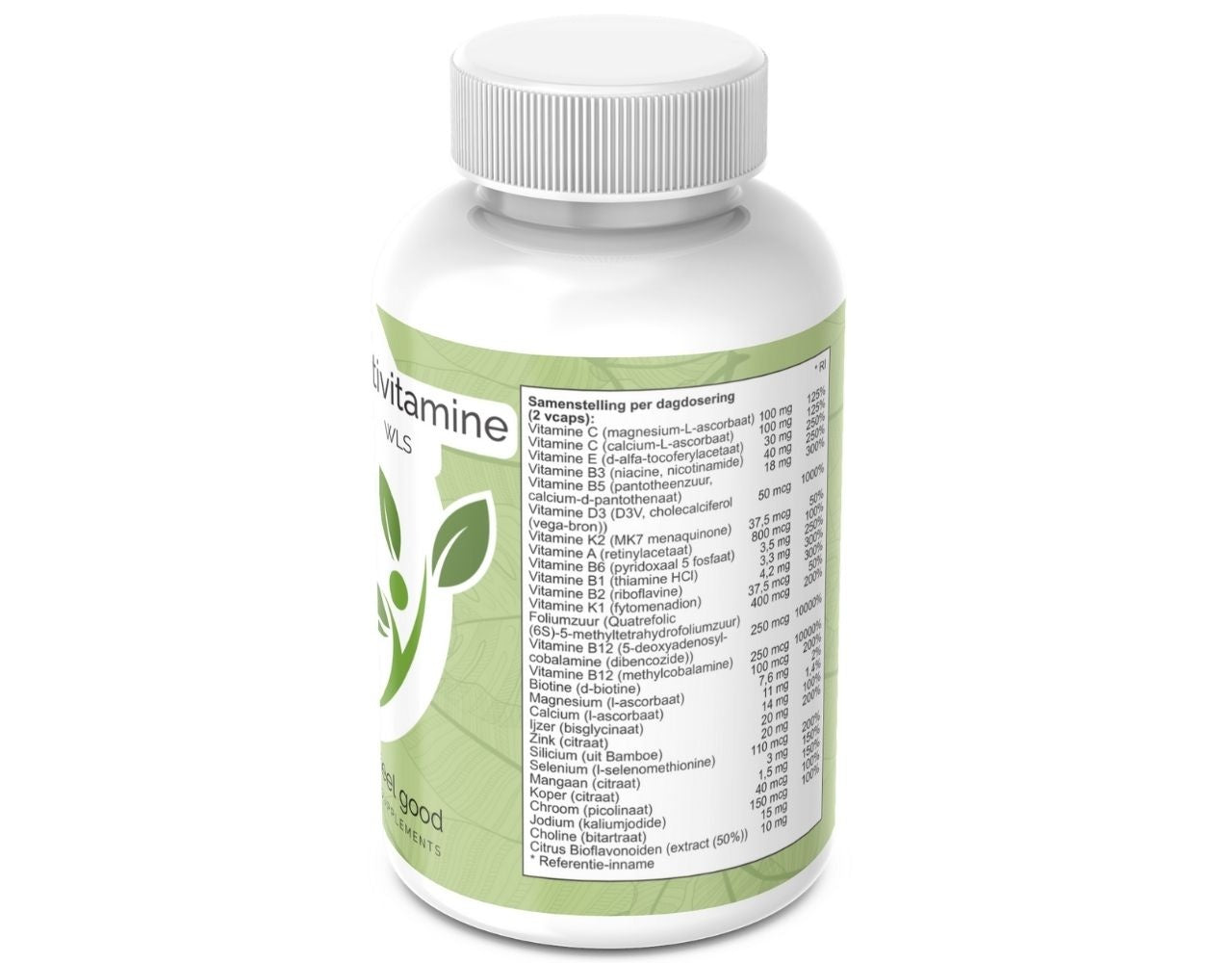 Vitaminen, mineralen, HPMC (verdikkingsmiddel/capsulehuls), choline bitartraat, Bamboe silica extract, bioflavonoiden, magnesium stearaat (plantaardig - antiklontermiddel), silicium dioxide (antiklontermiddel), microcrystalline cellulose (vulstof).